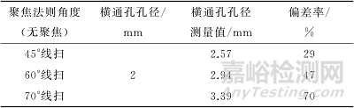 通過表2可以看出,測(cè)量值是實(shí)際值的兩倍以上,精確度較差。不同聚焦深度間實(shí)測(cè)數(shù)據(jù)偏差較小,這主要是因?yàn)樯疃?5 mm處已經(jīng)超過近場區(qū),超過了理論最大聚焦范圍。所以試驗(yàn)中聚焦深度的設(shè)置并非造成實(shí)測(cè)值和實(shí)際值偏差過大的主要因素。