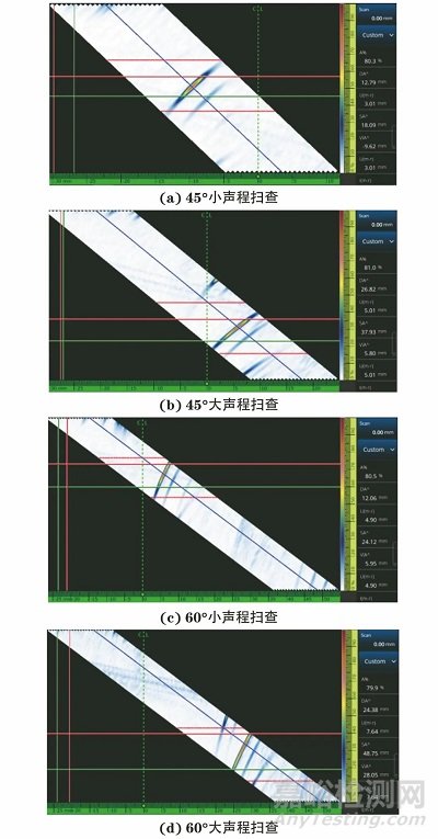 設(shè)置2組聚焦法則(45°和60°線掃),2組法則均設(shè)置為非聚焦模式,除角度不一致外其他參數(shù)均相同。以圖5試塊中豎直面橫通孔作為目標(biāo)反射體,分別以2組法則的小聲程和大聲程進(jìn)行橫通孔高度測(cè)量,測(cè)量結(jié)果如圖8所示。