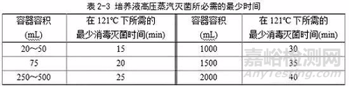 在121ºC的蒸汽溫度下可以很快殺死各種細(xì)菌及高度耐熱的芽孢桿菌,因此許多培養(yǎng)液的消毒滅菌壓力、溫度一般保持在1.0~1.1 kg/cm2、121ºC。消毒滅菌時(shí)間與需要消毒滅菌的培養(yǎng)液量密切相關(guān)(表2-3),時(shí)間不足達(dá)不到滅菌效果,時(shí)間過長培養(yǎng)液內(nèi)的一些化學(xué)物質(zhì)遭到破壞,影響培養(yǎng)液成分。消毒滅菌結(jié)束后,關(guān)閉熱源,只有當(dāng)滅菌器內(nèi)壓力降為零時(shí)才能打開放氣閥,排除剩余蒸汽,取出培養(yǎng)液。不可在壓力較高時(shí)打開放氣閥,引起減壓沸騰,使容器中液體溢出。