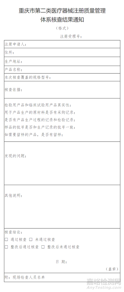附件:重慶市第二類醫(yī)療器械注冊(cè)質(zhì)量管理體系核查結(jié)果通知(格式)