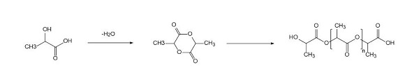 丙交酯是乳酸的環(huán)狀二聚體。在進(jìn)行二步法聚合生產(chǎn)PLA時(shí),將玉米、甘蔗、甘薯等淀粉質(zhì)原料經(jīng)微生物發(fā)酵制得乳酸后,使乳酸生成環(huán)狀二聚體的丙交酯,再開(kāi)環(huán)縮聚生成PLA。目前二步法也是生產(chǎn)PLA較為成熟和主流的方法。