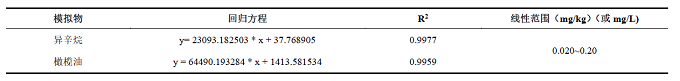 以丙交酯標(biāo)準(zhǔn)溶液的峰面積為縱坐標(biāo)(Y),對(duì)應(yīng)的質(zhì)量濃度為橫坐標(biāo)(X, mg/L)或(X, mg/kg)作線性方程。在0.020~0.20 mg/kg(或mg/L)濃度范圍內(nèi), R2≥0.995,峰面積與濃度呈良好線性關(guān)系。兩種模擬物的線性方程與R2見(jiàn)下表。