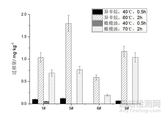 綜合以上實(shí)驗(yàn)結(jié)果可知,溫度是導(dǎo)致本次遷移實(shí)驗(yàn)中橄欖油的遷移量結(jié)果高于替代條件下異辛烷遷移量的主要原因。