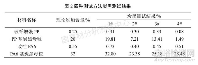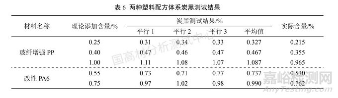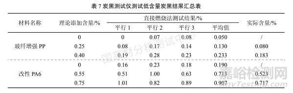 表 7 是使用炭黑測(cè)試儀(4#方法) 測(cè)試玻纖增強(qiáng) PP 和改性 PA6 的結(jié)果匯總表。