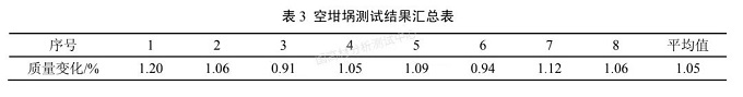 用表 1 中的炭黑測(cè)試程序隨機(jī)測(cè)試 8 個(gè)經(jīng)集中回收處理過(guò)(回收程序:濃硫酸浸泡超聲 1h 后清洗,隨后在 850℃馬弗爐中至少煅燒2h)的空Al2O3 坩堝,質(zhì)量統(tǒng)一填寫(xiě)2mg,炭黑處理溫度區(qū)間(620~770℃), 測(cè)試結(jié)果匯總見(jiàn)表3。