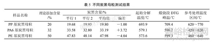 由表5可知,以理論添加含量為基準(zhǔn)三種炭黑母粒測(cè)試結(jié)果偏差均可控在±5%以內(nèi),且三種炭黑母粒對(duì)應(yīng)的參考處理溫度區(qū)間、起始分解溫度和煅燒段 DTG 峰溫各不相同,這主要由炭黑種類和炭黑母?;w材料共同決定。因此不同塑料體系不能采用統(tǒng)一的炭黑處理溫度區(qū)間,對(duì)炭黑母粒的研究有助于通過(guò) DTG 曲線確定炭黑積分溫度區(qū)間,從而提高低含量炭黑測(cè)試結(jié)果準(zhǔn)確性。