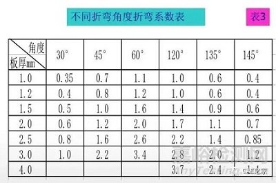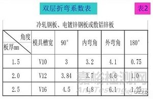 按表2,選用下模不同折彎系數(shù)不同,板厚不同折夸系數(shù)不同;
