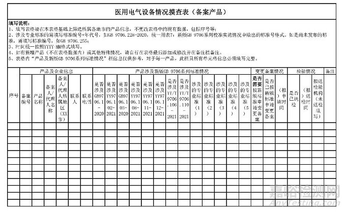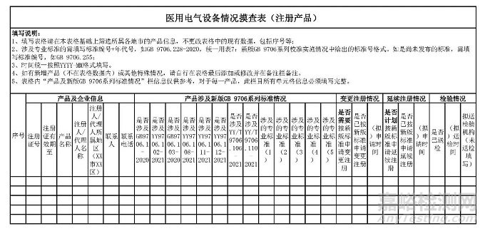 一、開展標準執(zhí)行情況摸查。各市局落實屬地監(jiān)管職責,按照省藥品監(jiān)管局下發(fā)的轄區(qū)內已獲準注冊產品清單,組織對轄區(qū)內產品的標準適用情況,以及檢驗、注冊或備案進展及計劃進行全面摸查,填寫《醫(yī)用電氣設備情況摸查表》(見附件1),并于4月10日前反饋至省藥品監(jiān)管局行政許可處。