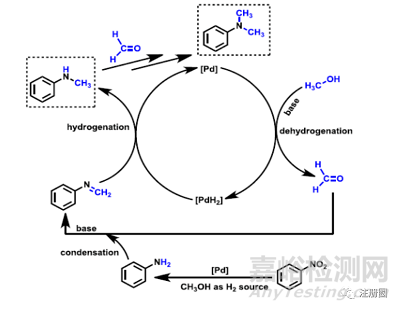 甲醇作為還原劑,參與反應(yīng),產(chǎn)生甲基化雜質(zhì),一般發(fā)生在鈀碳還原反應(yīng)中。文獻(xiàn)1提供的機(jī)理如下: