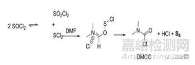 氯化亞砜制備酰氯時(shí),加入催化量DMF,可以加速反應(yīng),反應(yīng)過程可能產(chǎn)生DMCC致癌性雜質(zhì)和雜質(zhì)單質(zhì)硫,具體見下圖。
