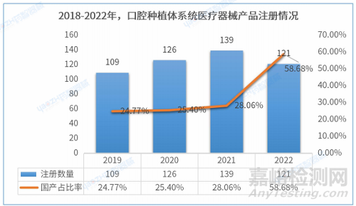 截至2022年底,口腔種植體系統(tǒng)醫(yī)療器械產(chǎn)品注冊總數(shù)為495件。其中,國產(chǎn)產(chǎn)品有169件,占比34.1%。2018-2022年總體注冊數(shù)量呈上升趨勢,口腔種植體系統(tǒng)醫(yī)療器械產(chǎn)品國產(chǎn)占比率逐年增大,2022年國產(chǎn)占比率已過半。