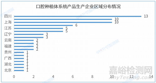 從口腔種植體系統(tǒng)醫(yī)療器械產(chǎn)品生產(chǎn)企業(yè)區(qū)域分布來看,四川省可生產(chǎn)口腔種植體醫(yī)療器械系統(tǒng)的生產(chǎn)企業(yè)數(shù)排名第一,有13家,占全國總數(shù)的18.5%。