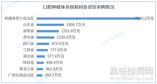據(jù)統(tǒng)計,截至2022年底,從各省采購口腔種植體系統(tǒng)耗材金額的排名來看,前五名中,新疆維吾爾自治區(qū)以7210.2萬元排名第一,其余分別為山東?。?906.7萬元)、湖南?。?552.8萬元)、貴州?。?229.0萬元)、四川?。?79.6萬元)。