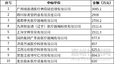 根據(jù)中標單位來看,廣州順意通醫(yī)療供應鏈管理有限公司以采購金額3085.1萬元排名第一;剩下排名前三的依次是四川存善堂藥業(yè)有限責任公司(2908.0萬元)和成都驊光醫(yī)療器械有限公司(2700.2萬元)。