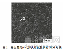 在0.2C-1.6Si-1.8Mn鋼冷軋板上切取尺寸為150mm×100mm×1.8mm的試樣,置于箱式電阻爐中加熱至950℃保溫180s,使之完全奧氏體化,隨后水淬至室溫。在經(jīng)上述處理的試樣上切取表面尺寸為6mm×8mm的金相試樣,采用體積分數(shù)4%硝酸酒精溶液浸蝕10s后,通過場發(fā)射掃描電子顯微鏡(SEM)觀察顯微組織。由圖1可知,水淬至室溫后試樣的顯微組織以板條馬氏體(M)為主。這是因為在快速冷卻過程中,碳和鐵原子來不及擴散,奧氏體不能分解為鐵素體(F)和滲碳體(Fe3C),只能形成成分與奧氏體相同的碳過飽和馬氏體。