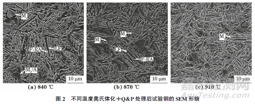 鐵素體(F)、殘余奧氏體(RA)、一次馬氏體(M1)和二次馬氏體/奧氏體(M2/A)島的碳含量和形態(tài)存在較大差別,用硝酸酒精溶液腐蝕后的SEM形貌呈不同的襯度和形態(tài),其中凹陷黑色組織為鐵素體,凸出組織并具有板條束亞結(jié)構(gòu)的為一次馬氏體,薄帶狀殘余奧氏體(F-RA)以單個板條存在,無明顯亞結(jié)構(gòu)的凸出粗大塊狀組織通常被認為是M2/A島。由圖2可見,在840℃奧氏體化并進行Q&P處理后,試驗鋼中存在較多的鐵素體,鐵素體大多呈帶狀,沿帶狀鐵素體(LF)長度方向分布著呈薄帶狀的殘余奧氏體,同時還存在一定數(shù)量的一次馬氏體,以及大塊狀的M2/A島。一次馬氏體形成于Q&P工藝一次淬火至Ms和Mf溫度之間。二次馬氏體形成于Q&P工藝二次淬火至室溫階段,由于未經(jīng)過配分階段的回火處理,其碳含量明顯高于一次馬氏體。當(dāng)奧氏體化溫度升高到870℃時,試驗鋼中的馬氏體含量增加,鐵素體含量減少,部分鐵素體仍呈帶狀,大塊狀的M2/A島基本消失。當(dāng)奧氏體化溫度為910℃時,鐵素體基本消失,試驗鋼組織以板條狀馬氏體為主。