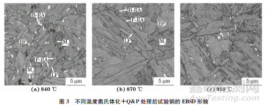 圖3中白色組織為殘余奧氏體,灰色組織為回火馬氏體或鐵素體,黑色組織為二次馬氏體。由圖3可見,經(jīng)840℃奧氏體化+Q&P處理后,試驗鋼中存在鐵素體、少量殘余奧氏體和一次馬氏體,以及極少量的二次馬氏體。其中,大部分鐵素體晶粒呈帶狀,少部分呈等軸狀;殘余奧氏體呈薄帶狀和塊狀2種形態(tài),薄帶狀殘余奧氏體主要沿帶狀鐵素體長度方向分布,塊狀殘余奧氏體(B-RA)主要分布在等軸狀鐵素體(BF)晶界處。當(dāng)奧氏體化溫度提高到870℃時,試驗鋼中的一次馬氏體含量增加,殘余奧氏體含量減少,二次馬氏體基本消失。當(dāng)奧氏體化溫度升高至910℃時,試驗鋼的組織以一次馬氏體為主,殘余奧氏體主要分布在馬氏體板條之間或原奧氏體晶界處。