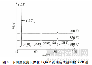 由圖5可見,隨著奧氏體化溫度的升高,Q&P處理后試驗鋼的(111)γ、(200)γ、(311)γ等晶面衍射峰的強度逐漸降低。計算可得當(dāng)奧氏體化溫度分別為840,870,910℃時,試驗鋼中殘余奧氏體體積分數(shù)分別為17.15%,8.90%,6.36%,殘余奧氏體含量隨奧氏體化溫度升高而降低。