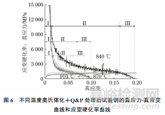 由圖6可知,3種溫度奧氏體化+Q&P處理后,試驗鋼的應(yīng)變硬化率曲線均可分為3個階段,分別是早期快速下降階段(階段I)、中期緩慢下降階段(階段Ⅱ)和最終頸縮快速下降階段(階段Ⅲ)。階段I通常與位錯的形成和滑移有關(guān),階段Ⅱ與殘余奧氏體的TRIP效應(yīng)相關(guān),階段Ⅲ與頸縮有關(guān)。當(dāng)奧氏體化溫度為840℃時,階段I對應(yīng)的真應(yīng)變區(qū)間范圍略小。這一方面是因為組織中存在大量鐵素體,而位錯更容易在軟相鐵素體中形成和滑移,滑移過程中逐漸塞積產(chǎn)生加工硬化,從而降低應(yīng)變硬化率下降速率;另一方面,組織中存在一定數(shù)量的粗大塊狀殘余奧氏體,這部分殘余奧氏體的機械穩(wěn)定性低,在較小的應(yīng)變下即能發(fā)生形變誘導(dǎo)馬氏體轉(zhuǎn)變(即產(chǎn)生TRIP效應(yīng)),形成的馬氏體也會增加應(yīng)變硬化率。在奧氏體化溫度為840℃下,Q&P處理后的試驗鋼具有更大范圍的階段Ⅱ,這與其組織中更高含量的殘余奧氏體并且殘余奧氏體具有粗大塊狀和薄帶狀2種不同形態(tài)有關(guān)。薄帶狀殘余奧氏體的穩(wěn)定性高于塊狀殘余奧氏體,2種不同穩(wěn)定性殘余奧氏體在拉伸變形過程的連續(xù)轉(zhuǎn)變有利于TRIP效應(yīng)的連續(xù)發(fā)生,從而擴展TRIP效應(yīng)區(qū)間,增大階段Ⅱ范圍。此外,高含量殘余奧氏體的存在有利于在頸縮階段繼續(xù)發(fā)生形變誘導(dǎo)馬氏體轉(zhuǎn)變,因此其階段Ⅲ的范圍也較大。綜上,在奧氏體化溫度840℃下,Q&P處理后的試驗鋼具有更大的斷后伸長率與其更強的TRIP效應(yīng)有關(guān)。
