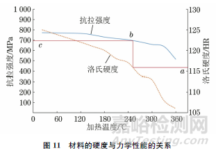 在現(xiàn)有設(shè)備條件下,可以采用洛氏或巴氏硬度測試的方法來檢測樹脂基復(fù)合材料的初始熱損傷。在利用該方法實施檢測時,應(yīng)首先通過試驗,分別制作材料力學(xué)性能與加熱溫度、硬度與加熱溫度的關(guān)系曲線,將該兩種曲線放在同一個坐標(biāo)系中(見圖11),便建立了材料力學(xué)性能與硬度的關(guān)系。實際檢測時,只需要進(jìn)行硬度測試,并獲得硬度(圖11中a點的值),即可反推材料的力學(xué)性能(圖11中c點的值)。結(jié)合相應(yīng)修理手冊中的評估標(biāo)準(zhǔn),即可確定損傷的程度。需要特別注意的是:材料的硬度隨加熱溫度的變化規(guī)律為非單調(diào)變化,因此檢測時應(yīng)從燒傷的區(qū)域開始,第一個臨界點即為損傷的邊界點。