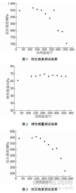 值得注意的是,材料的力學(xué)性能隨加熱溫度的變化是非單調(diào)的,呈先上升、后下降、再上升、再下降的變化規(guī)律。其規(guī)律主要表現(xiàn)在以下幾個方面:①在材料的固化溫度(200℃)以下,溫度對材料性能的影響比較輕微,基本可以忽略;②在材料的玻璃化轉(zhuǎn)變溫度(255℃)附近,材料的強度有一個上升的反常變化;③加熱溫度對材料彈性模量的影響較小,雖然有波動,但基本不影響使用性能。