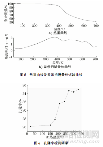 為了進(jìn)一步分析材料的初始熱損傷機制,對未經(jīng)加熱處理的材料進(jìn)行熱重-差示掃描量熱法試驗,對不同加熱條件下的材料開展了孔隙率檢測和掃描電鏡分析,結(jié)果如圖5~7所示。