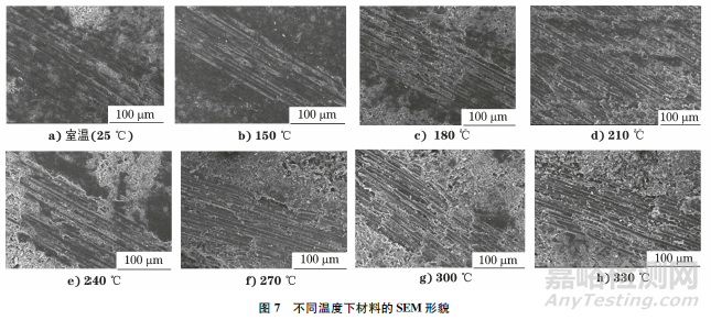從圖7可以看出:未經(jīng)熱作用的原試樣,即室溫下,其樹脂是緊緊覆蓋在纖維表面的,沒有特別明顯的界面;隨著溫度的升高,樹脂體系的表面開始出現(xiàn)氣孔,并且隨著溫度的升高,逐漸出現(xiàn)纖維與基體之間的貫穿性分離和纖維斷裂現(xiàn)象。