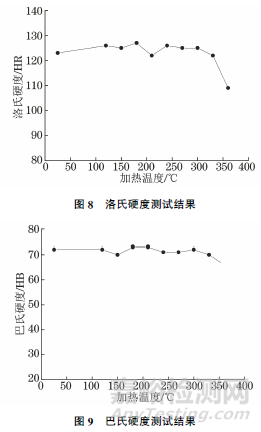 從上述幾種硬度測試的結(jié)果看,隨著加熱溫度的變化,材料的3種硬度都有明顯變化,且與前面介紹的材料力學(xué)性能同步。因此從原理上看,3種硬度測試方法可以用來檢測材料的熱損傷。從檢測的精度看,基于納米壓痕的維氏硬度對加熱溫度的變化最敏感,這主要是因為該方法測量的是顯微硬度,作用力小,反映的是基體以及基體與纖維界面的性能,正好與復(fù)合材料的初始熱損傷機制符合。對于巴氏硬度和洛氏硬度,由于材料變形的范圍較寬,測量結(jié)果受纖維的干擾比較大。從檢測的可操作性看,巴氏硬度測試是單面的,可在現(xiàn)場原位實施。洛氏硬度測試雖然也有可在現(xiàn)場原位實施的便攜式設(shè)備,但由于需要雙面加載,檢測范圍受設(shè)備尺寸限制。納米壓痕檢測雖然很靈敏,但目前尚不能實施原位檢測。