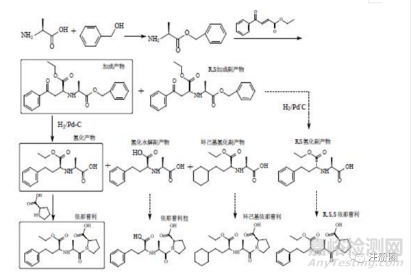 以馬來酸依那普利為例進(jìn)行說明,簡略合成路線見下圖,以L-丙氨酸為原料,經(jīng)酯化、加成、催化氫化、成酰胺等多步反應(yīng)制備馬來酸依那普利原料藥。在成品的合成路線中會產(chǎn)生副產(chǎn)物、降解產(chǎn)物等,我們可以通過原料藥的雜質(zhì)控制策略了解到更多的雜質(zhì)信息,進(jìn)一步評估由原料藥引入的雜質(zhì)。