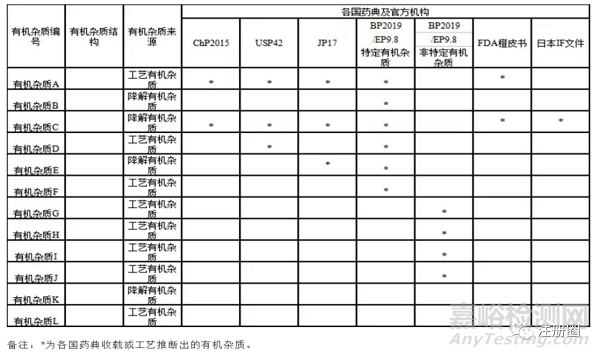 仿制藥的質(zhì)量標(biāo)準(zhǔn)通常能在各國藥典或官方機構(gòu)中查詢到,我們可以通過藥典對于雜質(zhì)的控制進(jìn)一步了解仿制藥的雜質(zhì)情況??蛇M(jìn)行如下匯總: