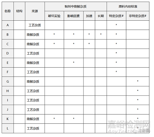 由上表可知,藥典標(biāo)準(zhǔn)收錄了雜質(zhì)A~L,原料藥中將雜質(zhì)A~F作為特定雜質(zhì)控制,其他均按未知單雜控制,由此可推斷雜質(zhì)G~L在原料藥中降解程度很小或者根據(jù)合成路線不會產(chǎn)生這些雜質(zhì);再根據(jù)制劑的穩(wěn)定性研究情況,可知雜質(zhì)B、C、E、K為降解雜質(zhì),其中雜質(zhì)B、C、E在原料中也作為特定雜質(zhì)控制,推測為API自身結(jié)構(gòu)產(chǎn)生的降解;而雜質(zhì)K在原料藥中作為非特定雜質(zhì)控制,而制劑中存在較明顯的降解,推測為API在輔料作用下或者制劑工藝過程中產(chǎn)生。綜上分析,制劑中將雜質(zhì)A~F與雜質(zhì)K進(jìn)行定量研究,并將雜質(zhì)B、C、E、K作為特定雜質(zhì)控制,其他均作為未知單雜控制。