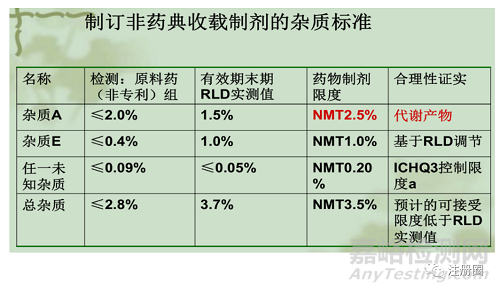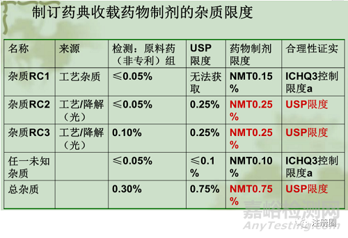 仿制藥的雜質(zhì)限度一般根據(jù)各國藥典標(biāo)準(zhǔn)或參比制劑的質(zhì)量進(jìn)行制定,示例如下: