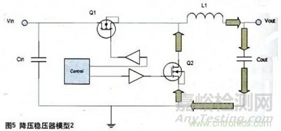 當(dāng)Q1關(guān)斷、Q2導(dǎo)通時,就形成了第二個回路。之后存儲在L1內(nèi)的能量流經(jīng)輸出電容器和Q2,如圖5所示。這些回路面積控制對于降低電磁干擾是很重要的,在PCB走線布線時就要預(yù)先考慮清器件的布局問題。當(dāng)然,回路面積能做到多小也是有實際限制的。