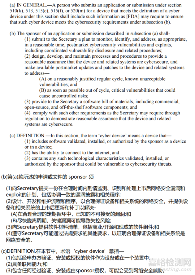 2022年12月29日,《the Consolidated Appropriations Act, 2023》(“綜合撥款法案”)簽署成為法律。綜合法案的第3305條——“確保醫(yī)療器械的網(wǎng)絡(luò)安全”——修訂了聯(lián)邦食品、藥品和化妝品法案(FD&C法案),增加了第524B條,以確保醫(yī)療器械的網(wǎng)絡(luò)安全。綜合法案規(guī)定,對《FD&C法案》的修正案將在2023年3月29日該法案頒布后90天內(nèi)生效。根據(jù)綜合委員會的規(guī)定,網(wǎng)絡(luò)安全要求不適用于在2023年3月29日前提交給美國食品和藥物管理局(FDA)的申請或提交。