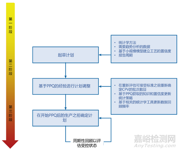 持續(xù)工藝確認(rèn)的開始是制定一個(gè)持續(xù)工藝確認(rèn)計(jì)劃,而持續(xù)工藝確認(rèn)計(jì)劃的設(shè)計(jì)可能要更早,可能開始于工藝驗(yàn)證的階段1,即開始建立商業(yè)化工藝的控制策略時(shí)。階段2通過工藝性能確認(rèn)(PPQ)會(huì)調(diào)整和確認(rèn)控制策略,因此也需要通過調(diào)整持續(xù)工藝確認(rèn)計(jì)劃。最終的持續(xù)工藝確認(rèn)計(jì)劃則會(huì)在PPQ之后,在正式的商業(yè)化生產(chǎn)之前確定。