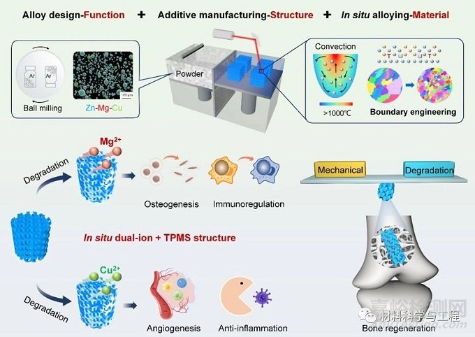 組織再生醫(yī)學(xué)基于可降解骨支架能夠?qū)崿F(xiàn)骨骼二次再生,但需同時(shí)滿足力學(xué)與降解行為、宏觀拓?fù)浣Y(jié)構(gòu)、生物學(xué)功能三方面要求。在前期研究工作基礎(chǔ)上(Acta biomaterialia, 2022, 153: 614-629;Additive Manufacturing, 2022, 60: 103256;Additive Manufacturing, 2021, 47: 102223;Materials Science and Engineering: C, 2020, 111: 110784.),魏青松、郭曉東和陳莉莉教授團(tuán)隊(duì)提出材料-結(jié)構(gòu)-功能一體化(MSFI)增材制造策略制備可降解鋅合金骨支架。增材制造的原位合金化與界面工程賦予鋅合金良好的力學(xué)性能。與此同時(shí),降解產(chǎn)物具有力學(xué)自增強(qiáng)效應(yīng),調(diào)控力學(xué)退化行為提高力學(xué)適配性。進(jìn)一步,MSFI鋅合金骨支架成功展現(xiàn)出原位生物學(xué)多功能,包括成骨、免疫調(diào)控、成血管和抗菌活性。持續(xù)降解釋放的二價(jià)金屬陽離子與三周期極小曲面結(jié)構(gòu)協(xié)同促進(jìn)骨再生增強(qiáng)骨整合。