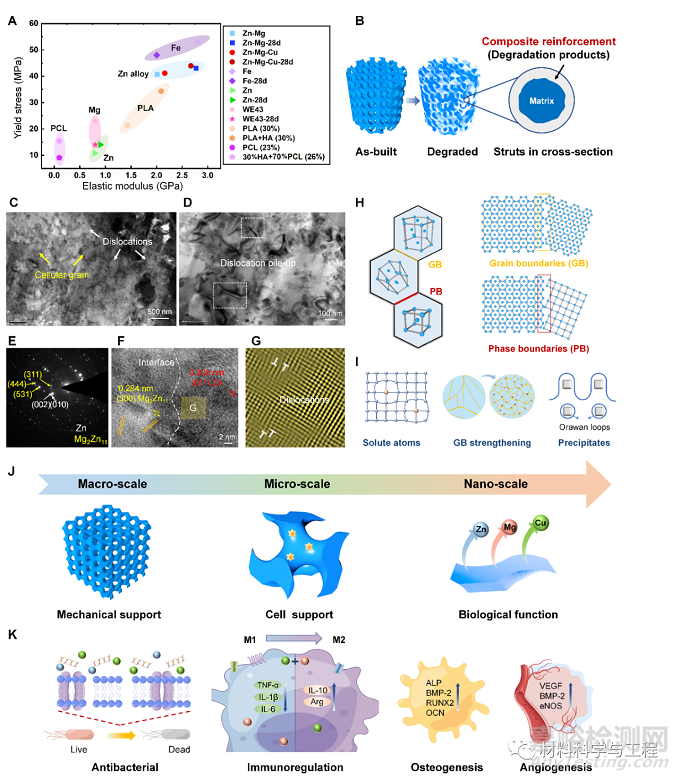 圖2 MSFI鋅合金骨支架降解行為適配、力學(xué)性能增強(qiáng)與生物學(xué)多功能機(jī)制圖