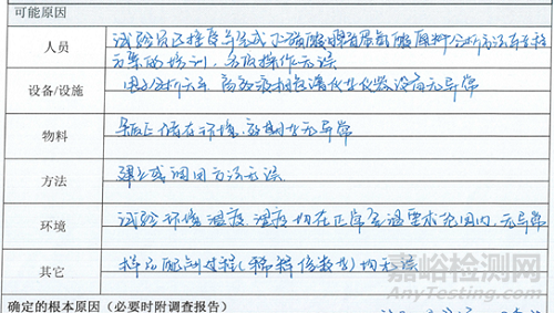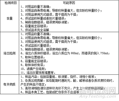對(duì)于各個(gè)環(huán)節(jié)可能出現(xiàn)的問(wèn)題進(jìn)行合理的假設(shè)并進(jìn)行重復(fù)檢測(cè),通過(guò)調(diào)查最終確定其偏差發(fā)生的根本原因。為此,對(duì)可能產(chǎn)生偏差的環(huán)節(jié)及其原因進(jìn)行了歸納總結(jié),如下表:
