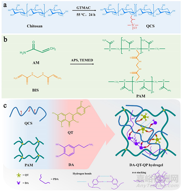 首先先將殼聚糖(CS)接枝改性為季銨鹽殼聚糖(QCS)(圖a)。丙烯酰胺(AM)在交聯(lián)劑BIS和引發(fā)劑APS的作用下發(fā)生聚合,形成聚丙烯酰胺(PAM)交聯(lián)網(wǎng)絡(luò)(圖b)。然后,將QCS溶液與DA溶液完全混合,加入QT作為抗氧化劑和抗菌劑與PAM形成相互穿插的交聯(lián)網(wǎng)絡(luò)(圖c),QCS分子鏈散布在聚丙烯酰胺網(wǎng)絡(luò)中,DA和QT表面豐富的酚羥基賦予水凝膠多種功能,最終制備成粘附性多功能抗菌水凝膠敷料。在多功能水凝膠中存在多種類型的交聯(lián)點:(i)單體AM和交聯(lián)劑BIS之間發(fā)生自由基聚合形成的交聯(lián)點;(ii)QCS鏈段和QT、PDA分子之間的相互作用力;(iii)-OH基團(tuán)與其他組分之間形成的氫鍵;以及(iv)PDA分子之間的π-π堆積。這些相互作用力共同為多功能水凝膠堅固結(jié)構(gòu)的構(gòu)筑提供了動力。