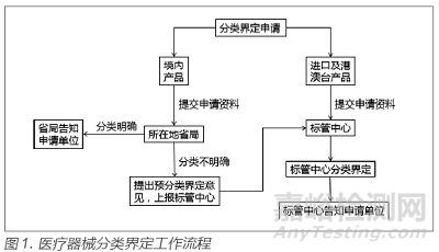 國家藥監(jiān)局醫(yī)療器械標(biāo)準(zhǔn)管理中心(以下簡稱“標(biāo)管中心”)、省級藥品監(jiān)督管理部門(以下簡稱“省局”)是分類界定工作的主要管理部門。其中,境內(nèi)產(chǎn)品的分類界定向所在地省局申請,省局對管理屬性和分類明確的產(chǎn)品直接告知申請單位,對管理屬性和分類不明確的產(chǎn)品提出預(yù)分類界定意見并上報標(biāo)管中心進(jìn)一步界定。標(biāo)管中心負(fù)責(zé)對進(jìn)口及港澳臺產(chǎn)品的分類界定申請和省局出具預(yù)分類界定意見的分類界定申請組織研究審查,并將界定結(jié)果告知申請單位,具體工作程序如圖1 所示[3]。