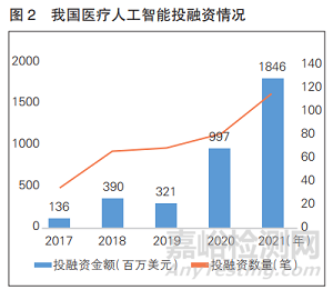 近年來,我國醫(yī)療人工智能投融資金額和筆數(shù)持續(xù)增長(詳見圖2)。據(jù)CB Insights統(tǒng)計(jì),2017年—2021年,我國醫(yī)療人工智能領(lǐng)域投融資金額復(fù)合增長率高達(dá)86%,累計(jì)達(dá)37億美元。同時(shí),我國醫(yī)療人工智能領(lǐng)域的投融資輪次逐年后移,2017年,我國醫(yī)療人工智能投融資尚處于萌芽階段,種子/天使輪及A輪類的初創(chuàng)公司占比高達(dá)79%;隨著產(chǎn)業(yè)發(fā)展,2021年,種子/天使輪投融資占比降為54%,B輪、C輪等比重不斷增大。2021年,主營眼科人工智能醫(yī)療器械產(chǎn)品的鷹瞳科技在香港掛牌上市,成為我國人工智能醫(yī)療器械第一股。
