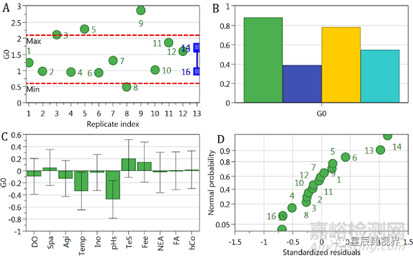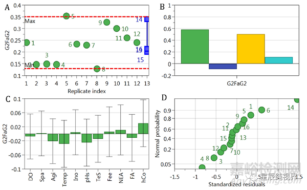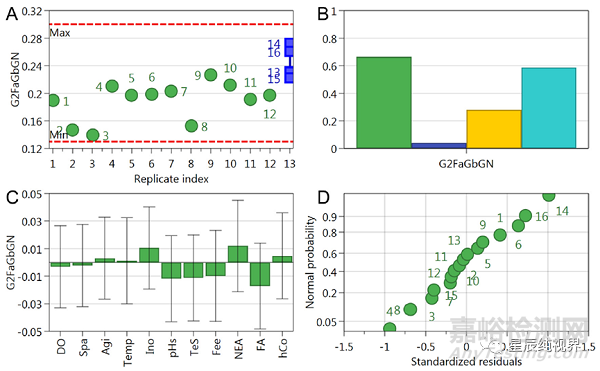 作者使用的Modde軟件,按照設(shè)計(jì)的順序進(jìn)行實(shí)驗(yàn),獲得糖型分析結(jié)果后,對結(jié)果數(shù)據(jù)進(jìn)行分析。常規(guī)分析思路還是遵循DoE的分析方法,比較R2,Q2,模型有效性和再現(xiàn)性,以及殘差等指標(biāo)。