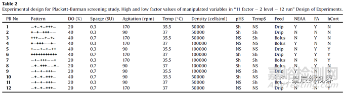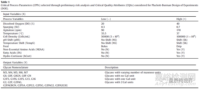 文獻(xiàn)中,作者選擇研究的關(guān)鍵質(zhì)量屬性為糖型,首先通過風(fēng)險(xiǎn)評估方法對工藝參數(shù)變量進(jìn)行篩選(風(fēng)險(xiǎn)評估過程未展示),最終確定了11個(gè)潛在有影響的工藝參數(shù)。因此,后續(xù)DoE實(shí)驗(yàn)的因子和響應(yīng)為: