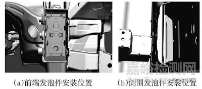 某高端車型使用乙烯-醋酸乙烯酯共聚物發(fā)泡材料,發(fā)泡材料在裝焊車間安裝,安裝后進(jìn)行白車身拼裝,發(fā)泡材料卡在空腔的特定位置。圖1 為某車型部分發(fā)泡件的安裝位置示意。發(fā)泡件經(jīng)過電泳烤箱后,膨脹可達(dá)數(shù)倍到數(shù)十倍。在汽車行駛過程中,膨脹后的發(fā)泡材料可以吸收產(chǎn)生的振動(dòng)和噪聲,同時(shí)消除空腔的振動(dòng)放大效應(yīng),降低車廂內(nèi)噪音[9]。