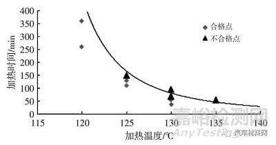 通過對(duì)發(fā)泡件進(jìn)行不同溫度和時(shí)間的保溫,得到溫度和時(shí)間對(duì)發(fā)泡件膨脹程度的關(guān)系。如圖15 所示,菱形點(diǎn)表示不合格點(diǎn),三角形點(diǎn)表示合格點(diǎn)。從圖中可以看出,隨著溫度的升高,發(fā)泡件膨脹所需的時(shí)間逐漸變短。溫度<120 ℃時(shí),發(fā)泡件不再膨脹。