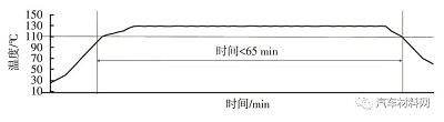 從試驗(yàn)中得出,隨著溫度的升高,發(fā)泡件膨脹至臨界狀態(tài)所需的時(shí)間逐漸變短。發(fā)泡件在130 ℃、保溫時(shí)間>65 min,發(fā)泡程度超過臨界狀態(tài);溫度<120 ℃,保溫時(shí)間>360 min,發(fā)泡程度未超過臨界狀態(tài)。發(fā)泡件在臺(tái)階溫度下,膨脹門檻溫度從120 ℃降至110 ℃。發(fā)泡件膨脹具有累加效應(yīng),對(duì)于已加熱過而未發(fā)生膨脹的發(fā)泡件,再次進(jìn)行加熱時(shí),第2 次加熱膨脹至臨界狀態(tài)的時(shí)間小于未加熱過的發(fā)泡件;其總加熱時(shí)間大于單次加熱至臨界狀態(tài)所需的時(shí)間。通過不同溫度的加熱測(cè)試,得到溫度、時(shí)間與發(fā)泡件膨脹的關(guān)系,制定了合格件的熱循環(huán)曲線。在實(shí)際生產(chǎn)中,加熱狀態(tài)低于熱循環(huán)曲線,發(fā)泡件不會(huì)發(fā)生過度膨脹。本文為生產(chǎn)現(xiàn)場(chǎng)出現(xiàn)設(shè)備停機(jī)時(shí),制定維修策略和判斷過烘烤車身是否合格提供了數(shù)據(jù)依據(jù)。