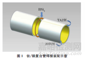 試驗(yàn)所用鈦/鋼復(fù)合管外徑為42mm;其中基材為工業(yè)純鈦,厚2mm,覆材為2鋼,厚3.5mm,統(tǒng)一加工長(zhǎng)度為55mm。BNi2非晶合金箔片厚度為30~40μm,經(jīng)差熱分析得到其熔化溫度范圍在974~990℃。
