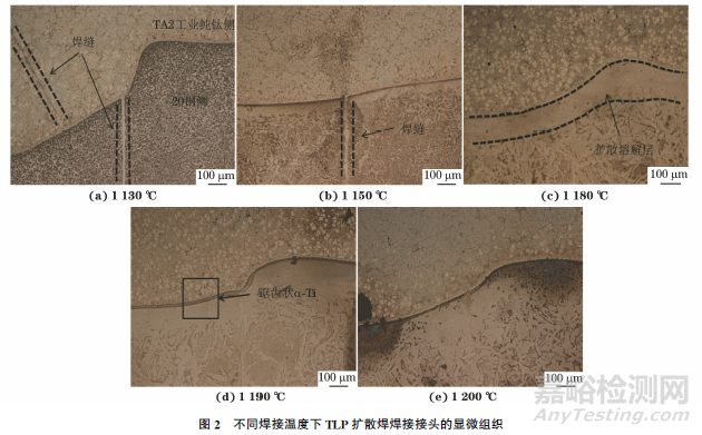 焊接前鈦/鋼復(fù)合管20鋼側(cè)組織為鐵素體與黑色塊狀分布的層片狀珠光體;鈦側(cè)為細(xì)小等軸狀α相固溶體。觀察發(fā)現(xiàn),不同焊接溫度下鈦/鋼復(fù)合管TLP擴(kuò)散焊接頭成形良好,無(wú)孔洞、裂紋等宏觀缺陷。選取5組具有代表性的焊接溫度進(jìn)行分析,結(jié)果如圖2所示。當(dāng)焊接溫度為1130℃時(shí),接頭兩側(cè)均有明顯焊縫存在,母材組織均勻。當(dāng)焊接溫度為1150℃時(shí),20鋼側(cè)界面出現(xiàn)擴(kuò)散溶解層,由于鈦導(dǎo)熱性差,高溫條件下α-Ti等軸晶長(zhǎng)大,焊縫邊界模糊。當(dāng)焊接溫度為1180℃時(shí),鈦側(cè)α相晶界處析出大量β第二相;而鈦/鋼復(fù)合界面由于焊后冷卻結(jié)晶溫度區(qū)間窄,接頭冷卻速率快,β相不能完全轉(zhuǎn)化為α相,從而使界面處出現(xiàn)不規(guī)則鋸齒狀組織。當(dāng)焊接溫度為1190℃時(shí),鈦側(cè)組織由α+β雙相組成,鋼/鈦復(fù)合界面呈現(xiàn)較多不規(guī)則鋸齒狀α-Ti相;20鋼側(cè)焊縫變窄且無(wú)殘留脆性相,組織由粗大針狀組織組成,這是因?yàn)樵?150~1200℃溫度范圍20鋼的鐵素體與珠光體長(zhǎng)大,此時(shí)鐵素體多為粗大的針狀組織。當(dāng)焊接溫度達(dá)到1200℃時(shí),鈦側(cè)組織由焊接前的單相等軸狀轉(zhuǎn)變?yōu)?alpha;+β雙相態(tài);20鋼側(cè)仍由鐵素體+珠光體組成,但針狀鐵素體組織變粗。