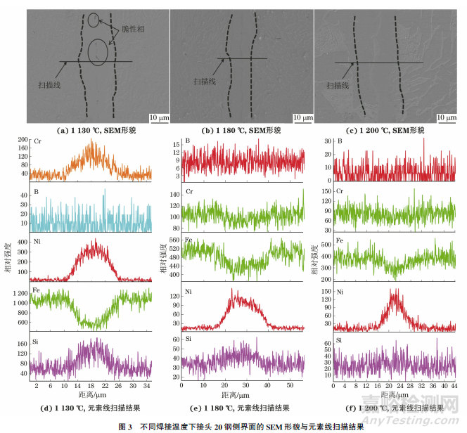 由圖3可見,當(dāng)焊接溫度為1130℃時(shí),20鋼側(cè)焊縫寬度約90μm,焊縫中存在殘余黑色脆性相,表明中間層材料在此溫度下擴(kuò)散不充分,硼、鉻元素分布比較均勻,在連接區(qū)域過(guò)渡平滑;20鋼側(cè)母材中鐵元素由兩側(cè)向焊縫擴(kuò)散,但擴(kuò)散距離較短,線掃描曲線呈“凹坑”狀;而焊縫中鎳元素的線掃描曲線有明顯突出峰,說(shuō)明鎳元素存在富集。當(dāng)焊接溫度為1180℃時(shí),20鋼側(cè)焊縫中沒有殘余中間層及脆性相,鐵、鎳、鉻元素的擴(kuò)散距離增加,線掃描曲線逐漸平滑,說(shuō)明接頭元素分布均勻,接頭質(zhì)量較好。當(dāng)焊接溫度為1200℃時(shí), 20鋼側(cè)焊縫變寬且界面彎曲,鐵元素?cái)U(kuò)散充分,線掃描曲線近乎直線,鎳元素在焊縫處發(fā)生富集,硼元素在焊縫中分布均勻,硼是一種強(qiáng)烈的表面活性元素,因其原子半徑小,可作為降熔元素促進(jìn)其他元素?cái)U(kuò)散。