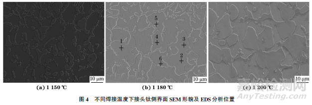 觀察發(fā)現(xiàn),在焊接溫度為1150,1180,1200℃時(shí)鈦側(cè)焊縫模糊,沒有明顯連接界面。為確定鈦側(cè)焊縫形貌及元素分布情況,分別選取1150,1180,1200℃焊接溫度下的微觀形貌進(jìn)行觀察。由圖4可以看出,鈦側(cè)接頭組織均由α+β雙相等軸晶組成,隨著焊接溫度升高,α-Ti晶界處分布的β-Ti長(zhǎng)大粗化。由表1可見,圖4中點(diǎn)1、3的成分相似,其中鈦元素質(zhì)量分?jǐn)?shù)高達(dá)90%,鐵元素質(zhì)量分?jǐn)?shù)僅為2%,因此推測(cè)此位置為鈦側(cè)基體;點(diǎn)2、5、6處鈦元素和鐵元素質(zhì)量分?jǐn)?shù)分別約為50%;點(diǎn)4處鈦元素質(zhì)量分?jǐn)?shù)為70%、鐵元素質(zhì)量分?jǐn)?shù)為30%,鐵元素含量較高的原因可能是除中間層中含有少量鐵元素?cái)U(kuò)散進(jìn)入外,20鋼側(cè)鐵元素也向鈦側(cè)進(jìn)行了異質(zhì)遷移,因此,推測(cè)此處為焊縫。